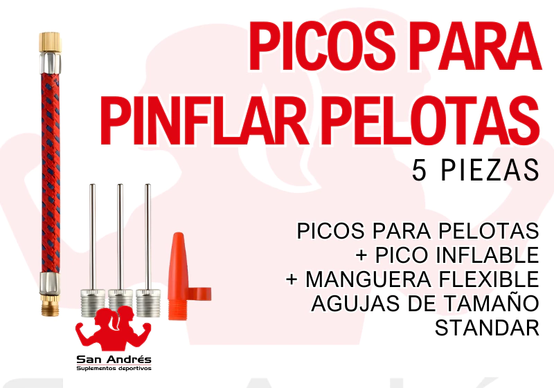 - Set completo de 5 piezas: 3 agujas metálicas, 1 boquilla plástica inflable y 1 manguera de aire flexible con adaptador.
